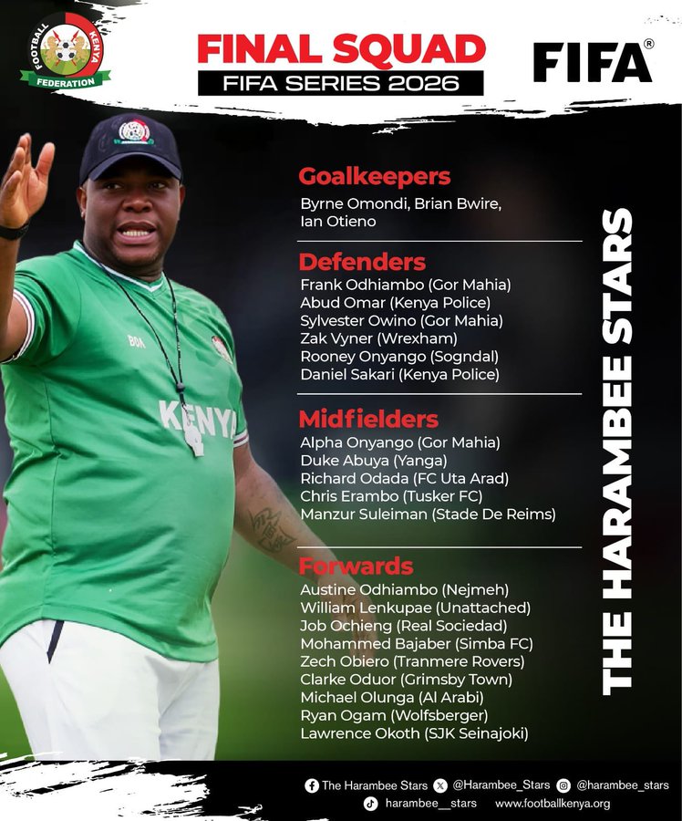 The roster features a mix of veteran leadership and fresh talent as the Stars begin intensive preparations for the 2027 AFCON, which Kenya will co-host alongside Uganda and Tanzania.
