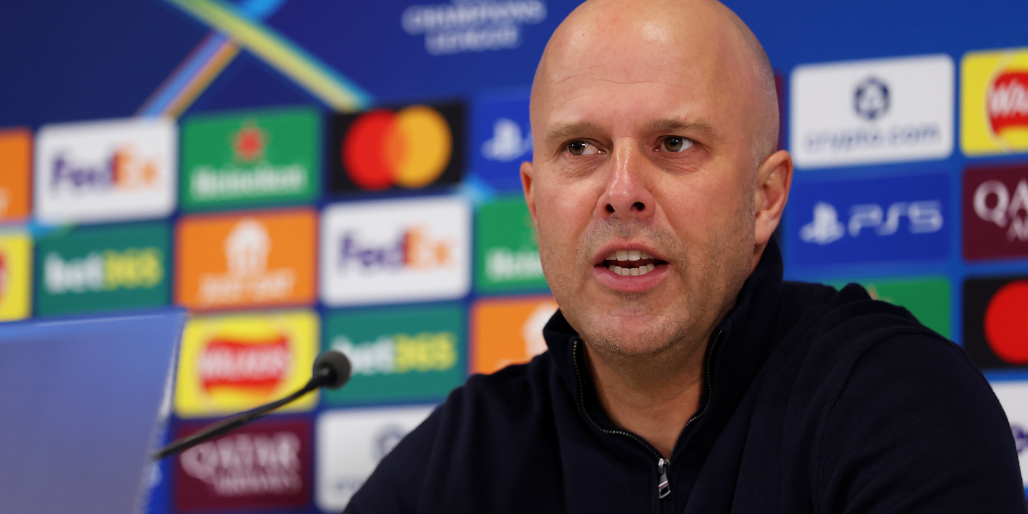 LIVERPOOL, ENGLAND - MARCH 18: Arne Slot, Manager of Liverpool, speaks to the media in a post match press conference after the UEFA Champions League 2025/26 Round of 16 Second Leg match between Liverpool FC and Galatasaray SK at Anfield on March 18, 2026 in Liverpool, England. (Photo by Alex Pantling - UEFA/UEFA via Getty Images)
